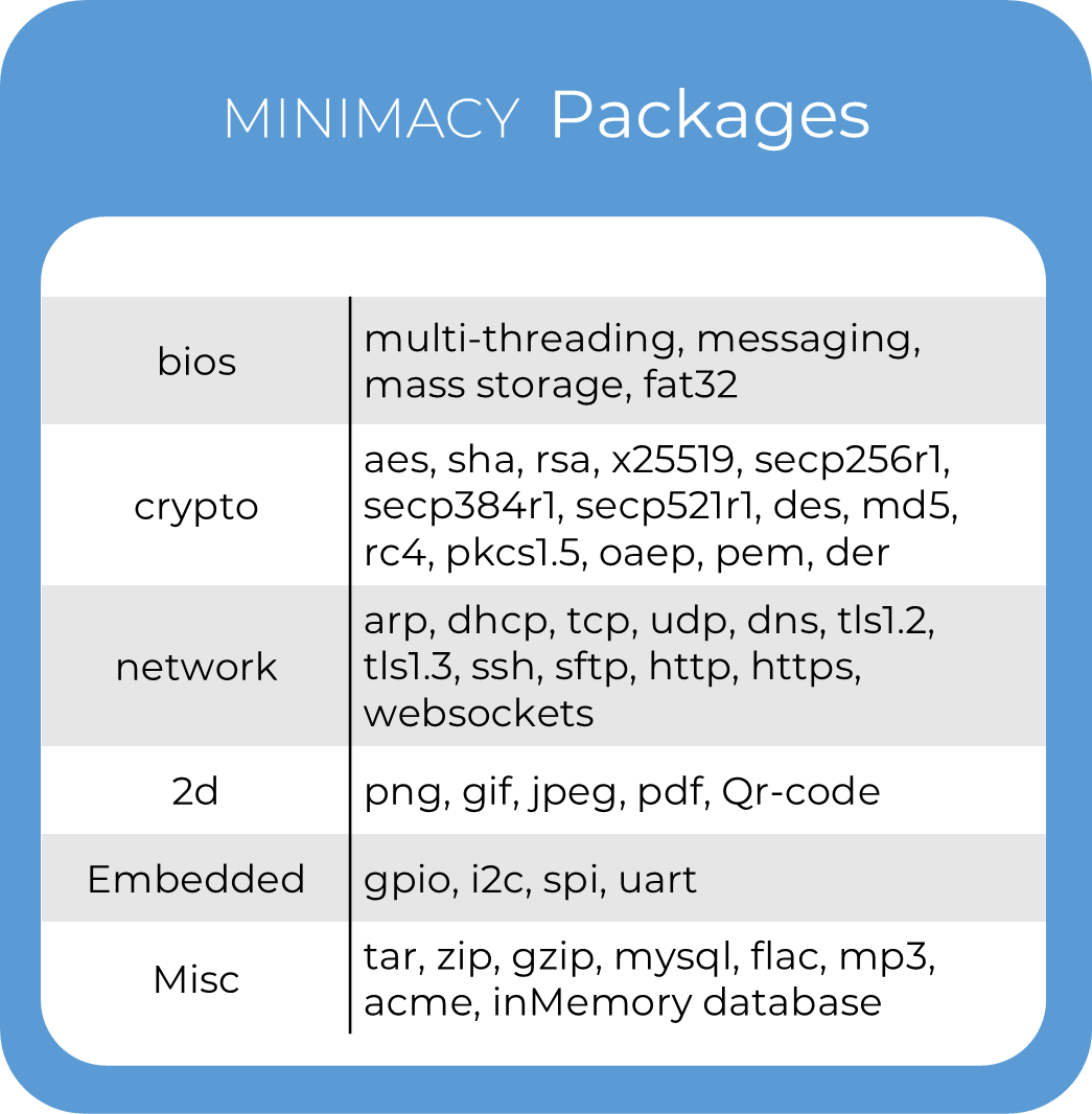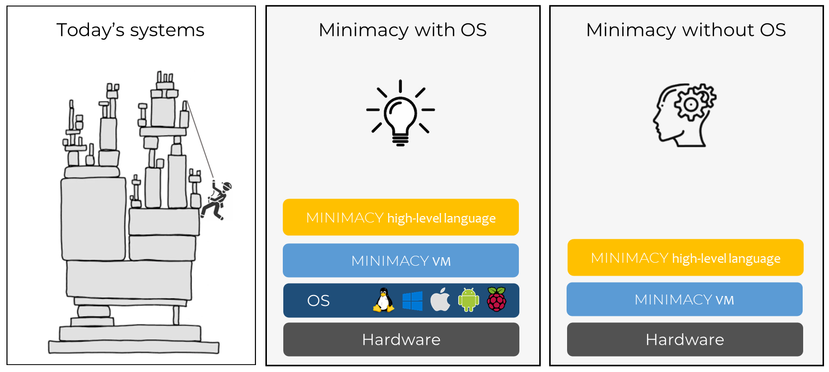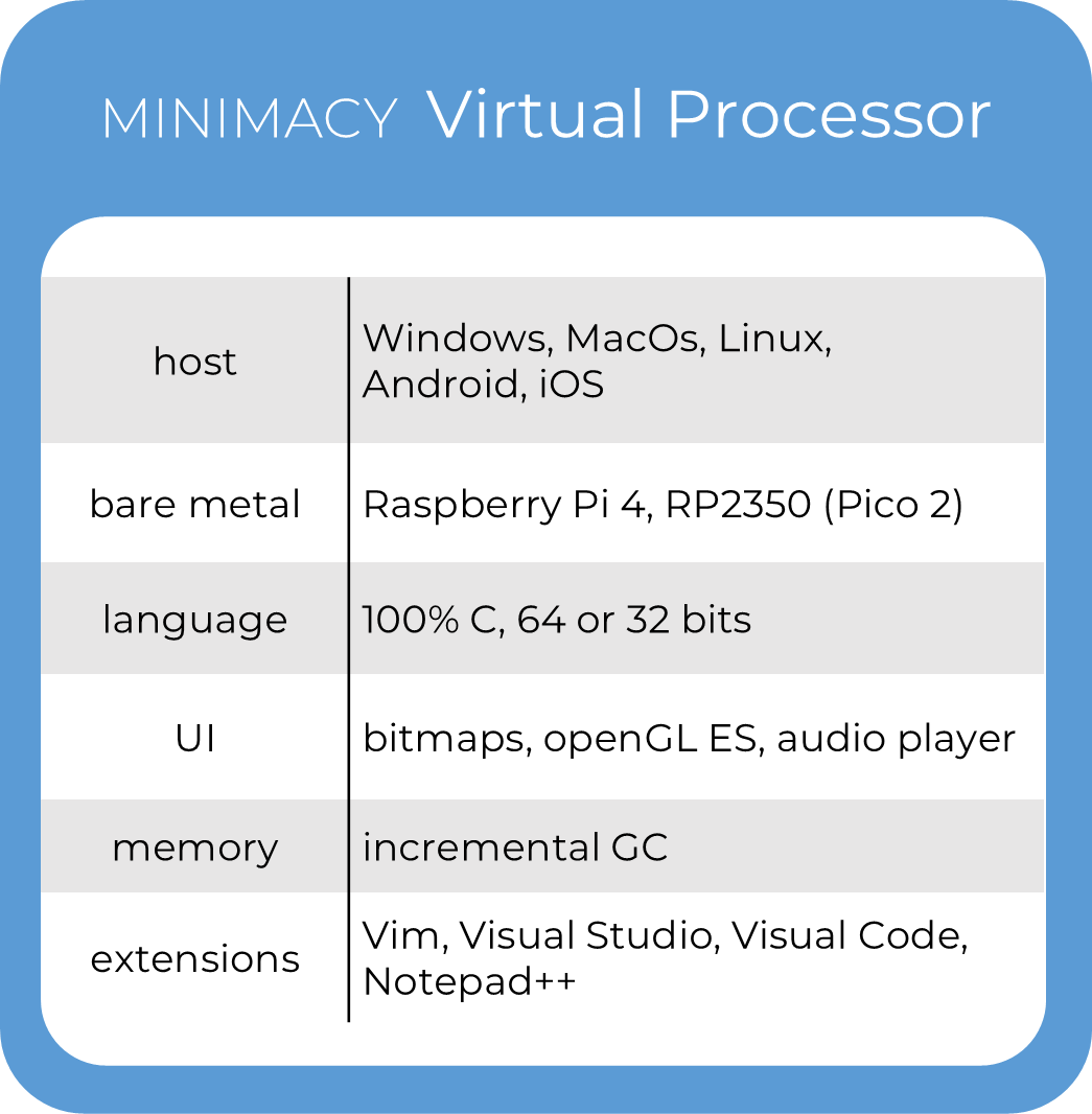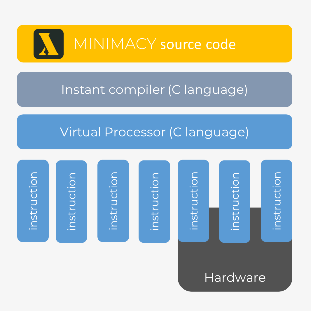 The virtual processor runs on Windows, Linux, MacOs, iOs, RaspberryPi with the minimum interaction with the operating system.MINIMACY runs also without an operating system, paving the way for a 100% understanding of your system.